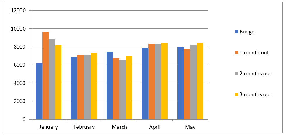 Figure 3 moves our spreadsheet forecasts to an alternative presentation: a graph. Some users may find that a data visualization provides a helpful perspective. Note that the three optimistic January forecasts are obvious in a graphic presentation, just as the March forecasts are obviously lower than the budget plan. Management should be asking: What are the forecasts telling us about the January Budget Plan? Are we prepared for the substantial January increase.