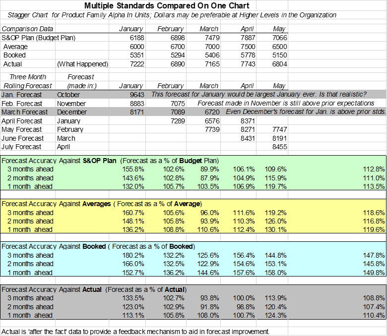 Standards: Using stagger charts provides for easy comparison of forecasts against standards. Comparisons are an important and major contribution of the technique. Comparisons give forecasters an effective way to evaluate the rolling forecast. These standards might be annual budget plan, average sales for a period in recent years or sales booked. Industry practice and the data available may suggest the use of other standards. Comparisons to standards such as these provide an objective measure against which to evaluate the forecast.