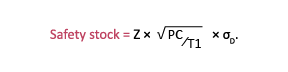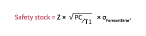 Using T1 to represent the time increments from which the standard deviation was calculated — which are one-week increments in our example — and PC to represent the total lead time or performance cycle length, this is the equation for safety stock:
