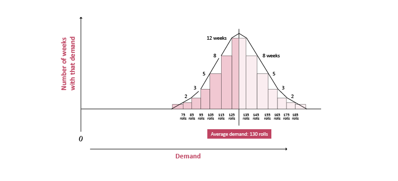 Statistics teaches that if a company carries extra stock equal to 1 sigma, that will be enough to cover demand for 84% of the cycles. Sigma is 28 rolls in this example, so if the company carries 28 rolls of safety stock in addition to the 130 rolls of cycle stock, that should be sufficient to prevent stockouts during 44 of the 52 weeks. If safety stock equals 2 sigma, that should cover 98% of the cycles.