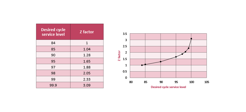 A company’s ideal safety stock level will be based on its tolerance for stockouts. For example, if company leaders decide that the company can tolerate stockouts during no more than 2% of the cycles, that sets the cycle service level (CSL) goal at 98%, which requires 2 sigma of safety stock, or 56 rolls in this example. A CSL is the percentage of cycles in which a company hopes to not have stockouts. The number of sigma required to achieve the CSL is called the service-level factor, or Z factor.