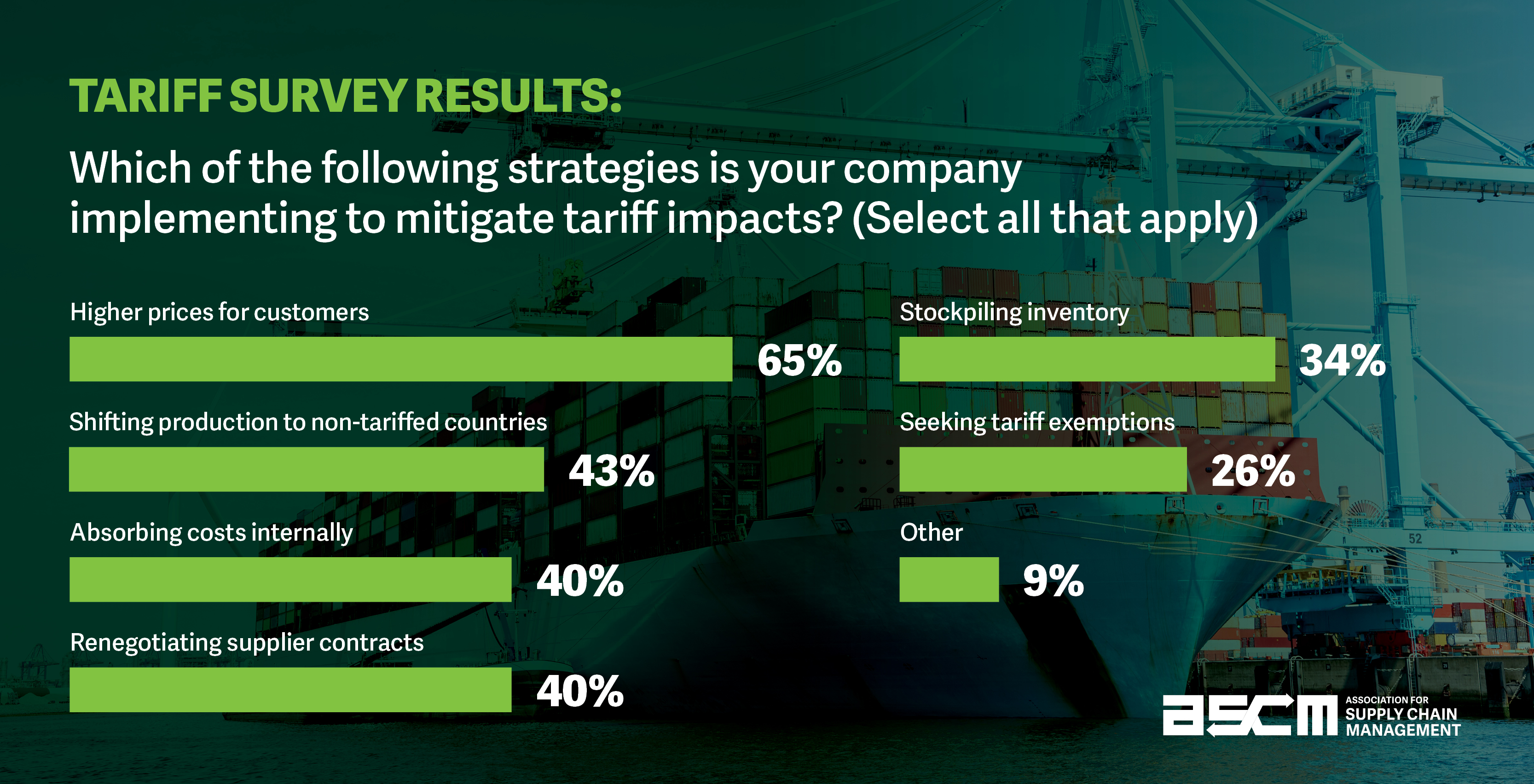 Quoted in today’s Wall Street Journal Logistics Report is a data point from an ASCM survey of 400 supply chain professionals, which revealed that 65% of organizations plan to pass on increased costs to their customers, a move that could lead to dissatisfaction and reduced demand. This hit to consumers is extremely concerning, with 41% planning moderate price hikes, 20% predicting high increases and 3% foreseeing extreme markups.