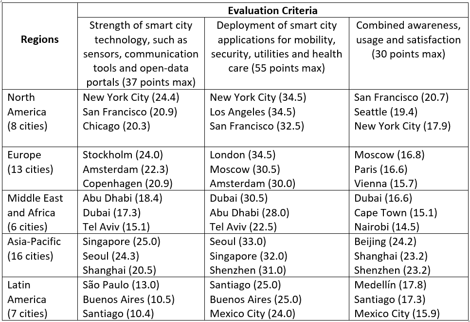 The McKinsey Global Institute has selected 50 cities around the world that it deems as leaders in smart city awareness and applications, including eight in North America, 13 in Europe, six in the Middle East and Africa, 16 in the Asia-Pacific region, and seven in Latin America (Woertzel et al. 2018). (See Table 1.) These cities were evaluated based on the strength of the smart city technology used; the deployment of smart city applications; and combined awareness of, usage of and satisfaction with smart city technologies. Unsurprisingly, developed countries are overall showing more progress than emerging nations. Still, the point values indicate that even the most progressive cities fall far short of the ideal.