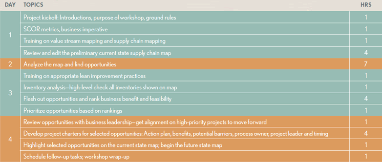 The first pilots were scheduled as five-day events. With lessons learned and more thorough preparation, this has been shortened to four days. As Figure 2 shows, preparation is critical. There must be a clear scope and well-understood need for improving the particular supply chain.